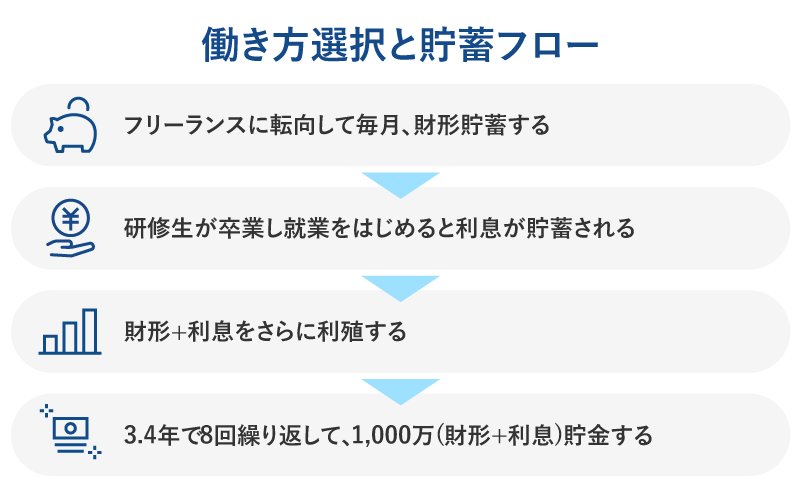 年間130名以上入社してくる研修生の育成費用として、財形貯蓄した資金を運用し利益を配当するしくみです。
